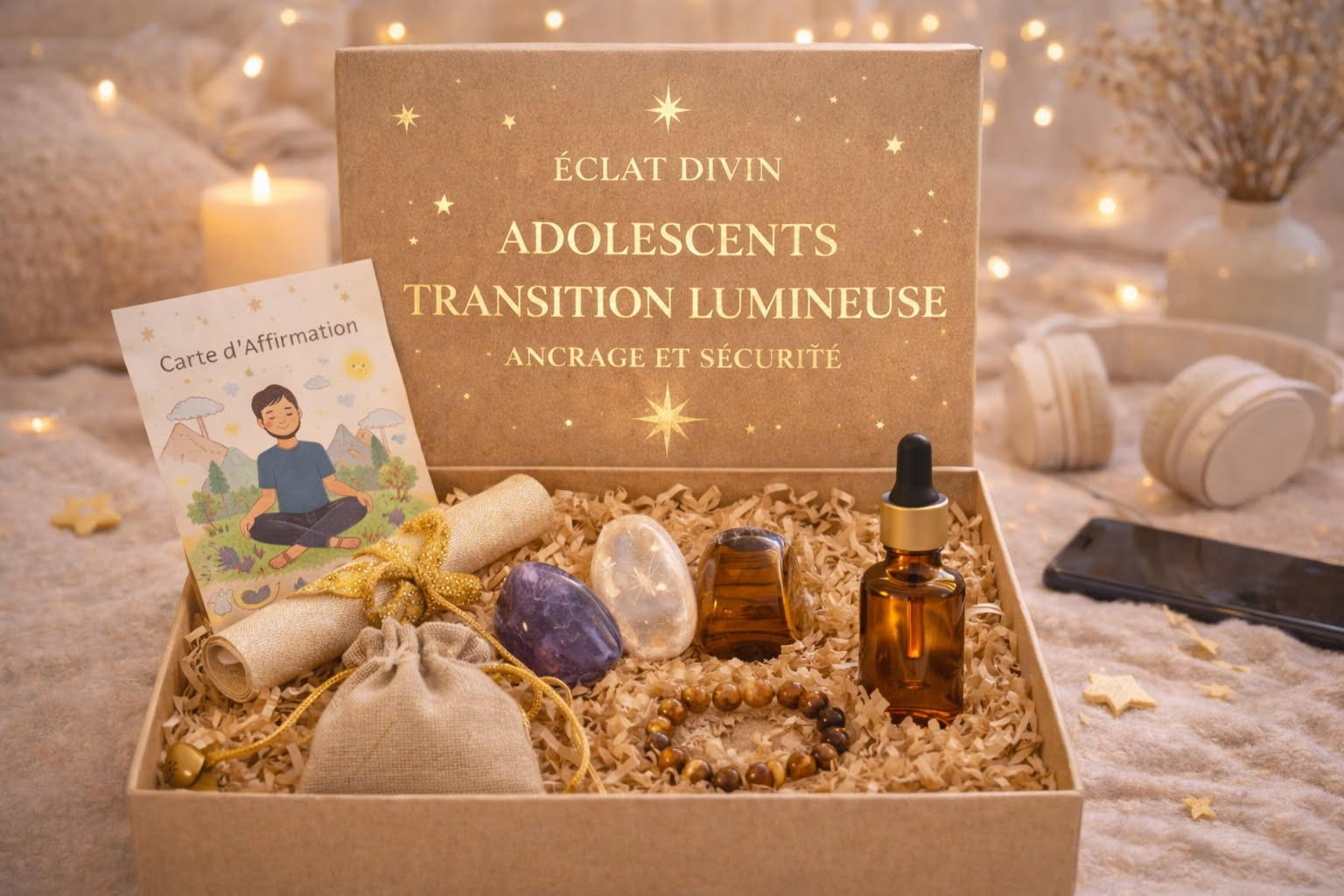 Un coffret singulier, symbole d’ancrage et de sécurité, qui accompagne le rite de passage vers l’adolescence. Âge conseillé à partir de 11 ans.